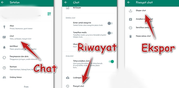 - Dalam aplikasi WhatsApp masuk ke menu Setting > lalu Chat > Riwayat Chat