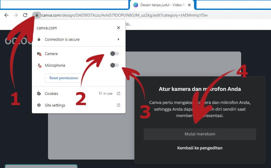 • Kalau tombol rekam tidak bisa, klik tombol gembok sesuai foto berikut. Berikan izin untuk Camera dan Microphone